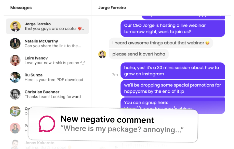 Once you connect your account to happydms, whenever someone comments, likes, or messages your Instagram profile, we'll store and display this data immediately.