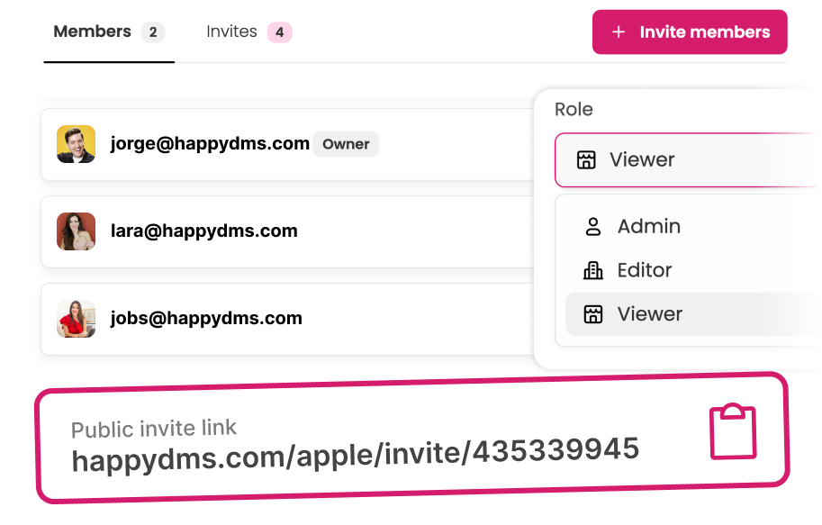 happydms is designed for teams and agencies from the ground up. Invite your team members, assign roles and permissions, and increase productivity